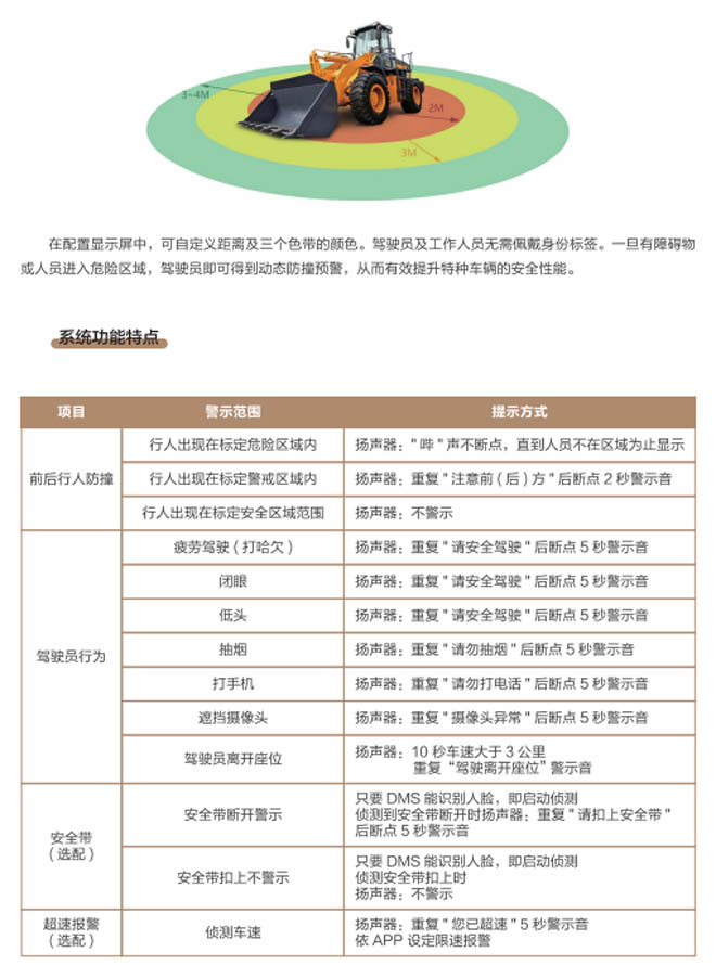 特種車(chē)輛智能識(shí)別防撞預(yù)警系統(tǒng)是專(zhuān)為工程車(chē)輛叉車(chē)、裝載機(jī)、挖掘機(jī)、推土機(jī)、礦山港口移動(dòng)車(chē)輛設(shè)備所設(shè)計(jì)的智能識(shí)別防撞預(yù)警安全裝置,能夠?qū)崟r(shí)偵測(cè)工作區(qū)域的危險(xiǎn)狀態(tài)并提供警示,有助于提升預(yù)防工程特種車(chē)輛作業(yè)安全。一旦有障礙物或人員進(jìn)入危險(xiǎn)區(qū)域,駕駛員可得到動(dòng)態(tài)防撞預(yù)警并發(fā)出報(bào)警進(jìn)行實(shí)時(shí)減速或停車(chē),該系統(tǒng)能在各種復(fù)雜廠區(qū)路況及工礦環(huán)境中幫助駕駛員避免危險(xiǎn),預(yù)防事故發(fā)生減輕壓力,提供豐富的駕駛員輔助環(huán)境感知等功能