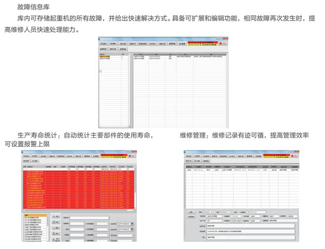 AGF系列起重機械安全監控管理系統是我公司自主開發研制的產品,按照國質檢特聯【2011】137號文件的要求,嚴格執行國標:GB/T 28264-2017生產,廣泛用于各行業大型起重設備機械、提升機、架橋機、港機、工程機械等,系統是為各種起重機的運行監視、診斷分析、設備預警與檢修維護而搭建的信息系統管理平臺。系統實時記錄起重機的運行參數、操作記錄,當滿足故障條件和設置預警值時,系統及時提醒和記錄各種事件信息,為起重機的操作人員和維護人員提供實時的、詳盡的歷史數據和分析報表。起重機安全監控管理系統具有可靠穩定性、靈活交互性、便捷易用性,是集實時監控﹑故障報警﹑數據登錄﹑設備維護﹑運行統計于一體的現代起重機綜合信息管理平臺。