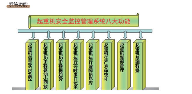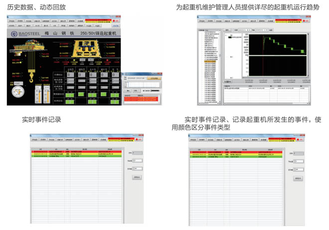 •- 通過起重機安全監控管理系統,運行管理人員可以通過系統對起重機運行中出現的故障進行 查詢和處理;對設備及元器件進行系統管理;指導定期對系統進行維修和調試。系統具備以 下功能:實時狀態顯示、實時報警顯示、歷史記錄查詢、部件壽命監測、事故診斷分析、數 據統計及權限設定管理等。