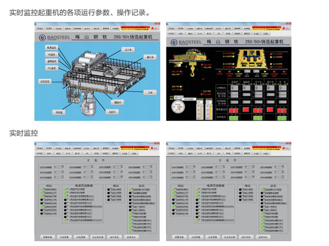 •-1、起重機狀態實時監測:對事故易發設備和重點關鍵設備的運行情況進行實時監測,同時 對采集的數據進行分析整理,并把現場的實際數據與相關的設備運行指標進行對比,超過偏 差限制時產生報警信息并存儲報警記錄。共享相關數據,為及時發現和消除設備故障隱患提 供必要的數據支持。