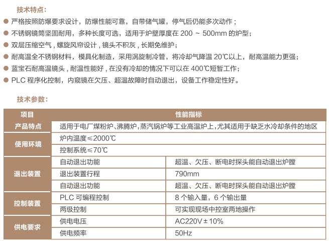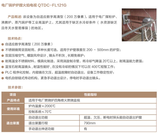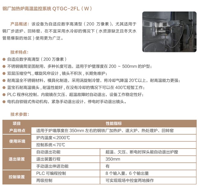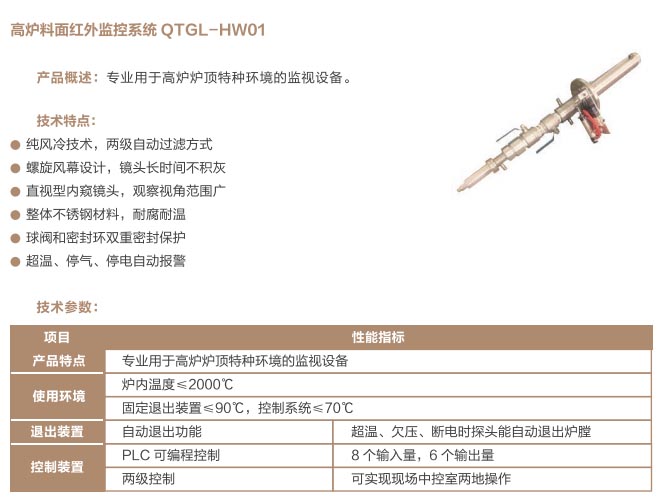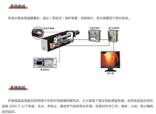 爐窯高溫監測監控系統是專為工業高溫爐窯監測監控的設計的智慧管理平臺,是針對爐壁開孔和爐窯視像有嚴格要求的高溫爐窯而研制的高溫工業電視。利用特種高溫孔式光學鏡頭,鏡頭設計采用中繼物鏡,兩次成像系統,使像面在遠離觀察孔的CCD靶面上形成,最大限度的減少進入攝像機的熱輻射,致力為冶金、電力、建材、礦山、化工等行業服務。我公司研發主導產品已擁有第三代SG內窺式高溫工業電視系列、爐壁式高溫工業電視系列、內窺式拐角高溫工業電視系列、鍋爐汽包水位電視系統等成套設備,以及各種風冷防護罩,水冷防護罩,渦旋制冷防護罩等工業監控設備配套產品。產品廣泛應用于鋼鐵廠加熱爐、退火爐,電廠鍋爐爐膛火焰、水泥廠回轉窯窯頭看火、篦冷機看料、玻璃廠玻璃熔窯等特殊高溫環境。幫助用戶進行工業爐實時電視監測及控制,解決設備的運行故障等,對用戶改善產品質量、降低成本、安全生產有著獨特的成效。受到了用戶的一致好評。